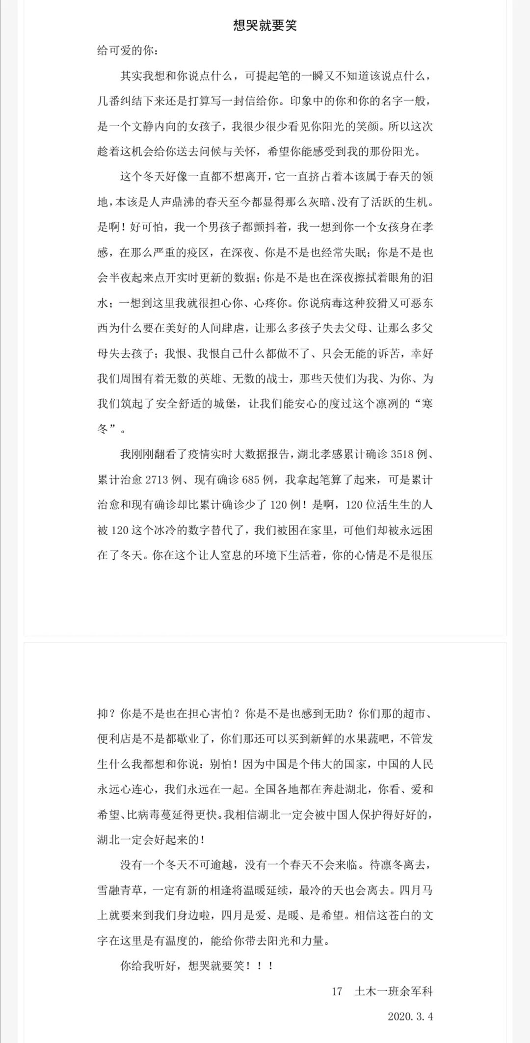 活动发起之后,建筑工程学院的同学们纷纷积极参加进来,分享了许多温暖人心的作品。虽然我们现在各自处于祖国的大江南北,但我们的心却紧紧联系在一起从未分开过。疫情之下,我们万众一心,互相挂念,携手共同抗击疫情,待春暖花开阳光重新洒满人间之日。