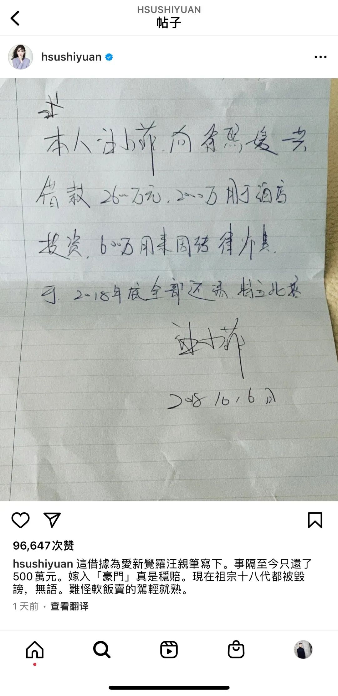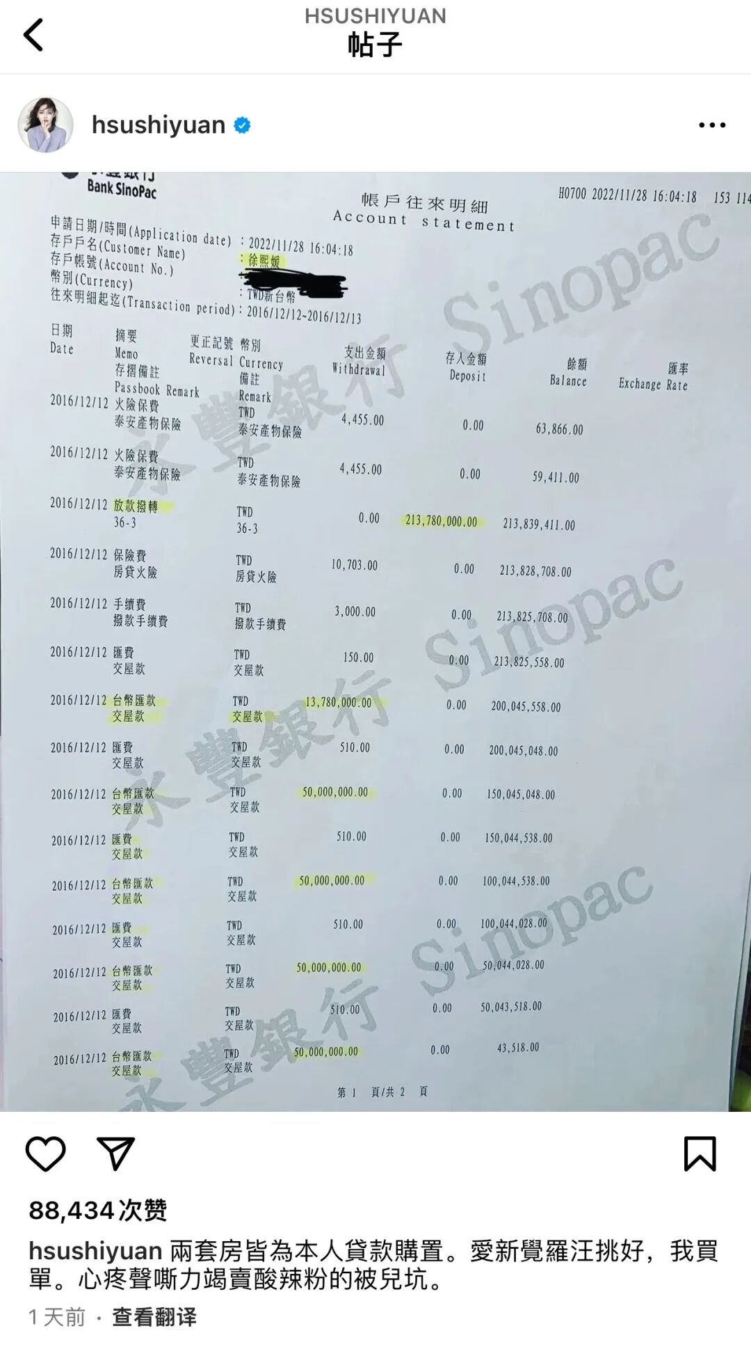 结果,汪小菲迅速反击晒出了离婚协议,又称自己在台湾没账户,才把钱汇到大S账户下以她名义购房。