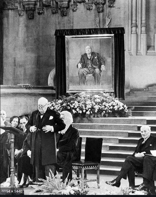 丘吉尔80岁生日恰好赶上国会开幕大典。两院委托著名现代派画家萨瑟兰为丘吉尔绘画官方肖像,作为他的生日礼物。正是这幅肖像画,促成他的辞职。