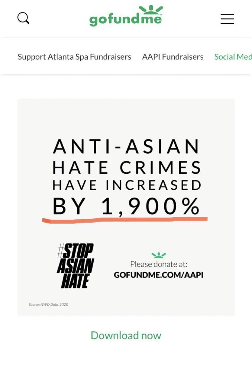 这里面首列就是一个对付警察的组织,当然组织名字是以“反警察恐怖”的名义,那么是如此吗?我们下面马上说到。再看第四个组织,名字叫做“华人支持优待法案(Chinese For Affirmative Action)”。这是前天的截图。今天再去看,这两个组织都被隐藏看不到了。可见组织方也怕明显招惹亚裔基层群众的反感。但是拿掉了就意味着他们真的不会受益了吗。不是,因为这个捐款已经明确说明,列出来的组织不是完整的名单,所以恐怕真正的动机只是碍于担心激起民愤,影响后续的募捐推广,而临时把这些争议大的组织隐藏起来。这个捐款还用了仇恨犯罪增加1900%这种惊人的数字来宣传,这个统计怎么来的?尽管该数据被媒体广为引用,其实种子都来自于新成立的、无过往记录可考证的同一组织。该组织名为“停止对亚太裔的仇恨(Stop AAPI Hate)“,由几个左翼激进主义团体创建,而他们在提供非营利组织财务来源的信息平台GuideStar上,还未登记任何资金信息,没有申报990。更多详细的情况请点击前文了解。而且该捐款项目发起时间有一定日子了,最早的目标是50万美元,已经多次修改目标上限,到3日19日目标变到了300万。感觉他们的策略是先让不在乎甚至支持肤色影响入学、就业政策的亚裔精英层,比如像开熊猫快餐的这类成功企业家捐头一波,现在借着亚特兰大凶杀案后草根们入场反仇恨亚裔犯罪的新风口,迅速把支持AA、反加强警力的组织隐藏掉,让草根们在不知情情况下,误以为是个无党派背景的活动,踊跃参加捐出第二波。“永动机”机制……