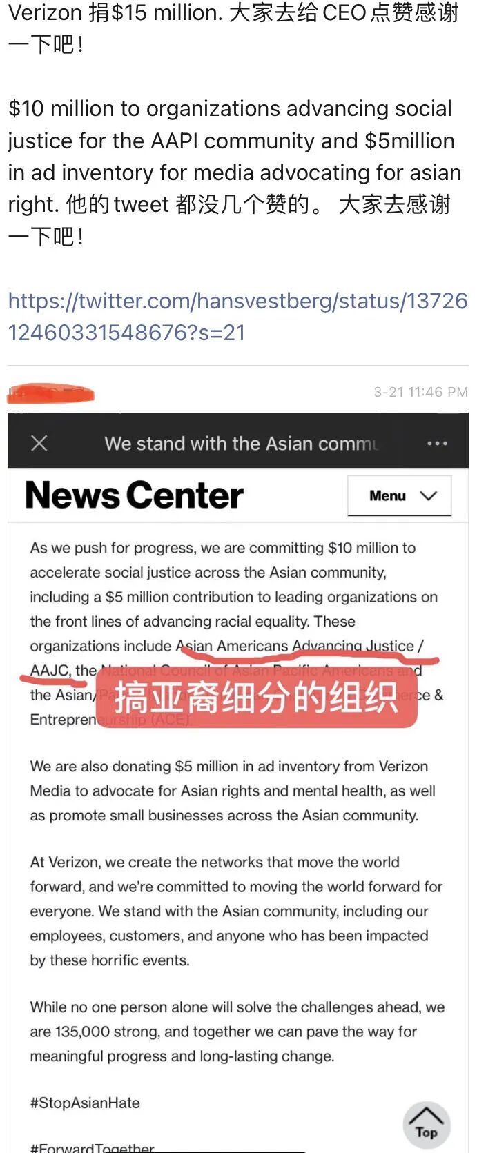 考虑到亚裔马上要在告哈佛案子上发起新一轮的冲刺,如果您是反对肤色政治的,就不要给这个活动捐款了,否则等于给马上要在法庭上过招的对手充值。另一个大公司Verizon捐款给了一个亚裔组织AAJC,也很快被群众们曝光支持肤色政策和亚裔细分的“历史”。我们社区有踏实的聪明人,请大家仔细看看后面两个对话内容,通透的人还是不少。事实已经很清楚了,包括Gofundme几个主要给AAPI stop hate的捐款,受益方都是支持肤色政治等政策的此类组织,其实还有一部分受益的势力,这个就去我们电报社区建设群看讨论吧(https://bit.ly/35Jtpak)。很快反对肤色政治的华人(比如加州反Pro16、华州反I-1000),就会看到曾经被自己打败的对手通过这次运动获得充足资金满血复活。政治一点不单纯。这些以“解决白人至上”为口号的运动,没有明说的是,附赠品是入学就业上的肤色政治、选择性避讳非白人的那些针对亚裔的犯罪包括仇恨犯罪、此外有很强的党性推手在背后——这里查完捐款受益方是哪些组织,就已经很明白了。而且这只是说了美国国内的局......有人也许会惊讶,这些亚裔精英组织为什么脱离群众。本质上,不是华人/亚裔精英畏惧群众,而是美国整个企业界和教育界,也就是华人精英们密集的地方,已经完全被左派的言论控制了。再加上主流媒体的党性化(点击前文),他们在工作场所接受的信息也是一边倒的有利于一个党的信息。所以这些精英华人的利益大多跟民主党是一致的,但是与中间派和保守派华人则不一定合拍。当然,这是笼统的说法,具体到个人,自然也有不少非民主党的精英。另外我们反对的是精英主义而不是精英,那些接地气的精英一直招人喜欢。总而言之,身份政治极为不靠谱。需要按照理念站队,否则让我们就因为同是一张华人脸从而去一会以保护言论自由为理由捐款保卫WX,一会又双标地拍手parler之死(点击前文),庆祝脸书、推特、YouTube想封谁就封谁吗?作为亚裔我们担忧白人至上,不过现实是来自左派白人的隐形的白人至上越来越严重。捐款给支持AA、亚裔细分和反加强警力的激进组织,给他们涨粉,最后结果并不缓解对亚裔的偏见仇恨,而是强化入学就业方面的系统性歧视。白人至上要反,白人左派搞出来了的肤色政治恐怕危害更普遍一点。这些左派白人感觉就像家长制、统治阶层思维,要控制亚裔这样的少数族裔的思想,连反歧视这事上都要求我们去按照他们认可的思路去反对。只可以把愤怒对向他们的政治对手搞出来的案件,而他们基本盘针对亚裔犯罪时候,大家都要忌惮“取消文化”,当成没发生甚至当成似乎没有出过人命一般,不断低调处理弱化问题。或者亚裔作为受害方,都得集体失明,看不见人家的真正肤色,而要统一按照白人左派分配、教育我们的,凶手是白人而且必须是右派白人,亚裔才可以进入愤怒模式。基本上就是左派白人的这个党来控制人的喜怒哀乐,让你愤怒你才能愤怒。如果越线白人左派制定的圈的范畴,他们对于胆敢逃逸的不听话的少数族裔,有很多帽子。比如,“近乎白人的优越”、“内心白人至上”、“爱数学是种族主义”......,等等。