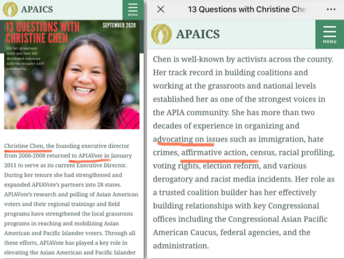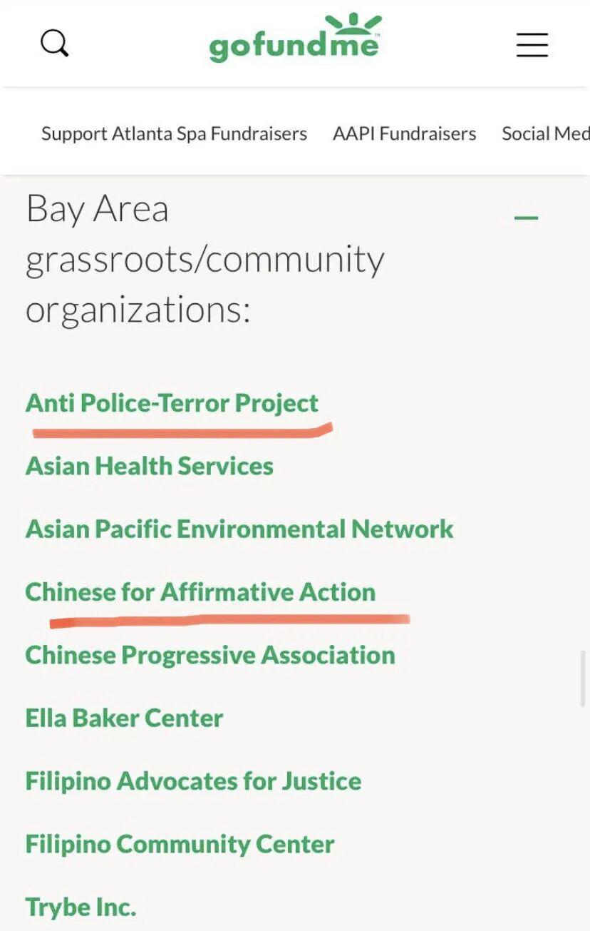 最为出名的一个捐款来自Gofundme平台上,一些AAPI组织的“反仇恨亚裔”的募捐。网站上有介绍组织者的背景,以及捐款受益方。首先他们列出来的首席活动家,也是捐款资金分配发放的首位负责人,是创立APIAVote组织的克里斯蒂·陈。那么这是何方神圣?笔者查了一下,克里斯蒂·陈是个支持“优待法案(Affirmative Action, AA)”的活动家。而这个法案在2019年在华盛顿州的版本叫做I-1000法案(点击前文),公投中被华州亚裔主导的草根运动推翻了。当时华州的华人捐出百万美元加上义工们持续数月上万小时的付出,才打赢这一艰苦的战役(点击前文)。而在加州,去年这个法案也以Pro16议案的形式显身,加州华人也从边缘到领军,打了一场“以弱胜强”并改变主流对亚裔陈见的选战(点击前文)。那么除了发起人这种背景,再看这个捐款列出来的受益组织都是些什么细节?
