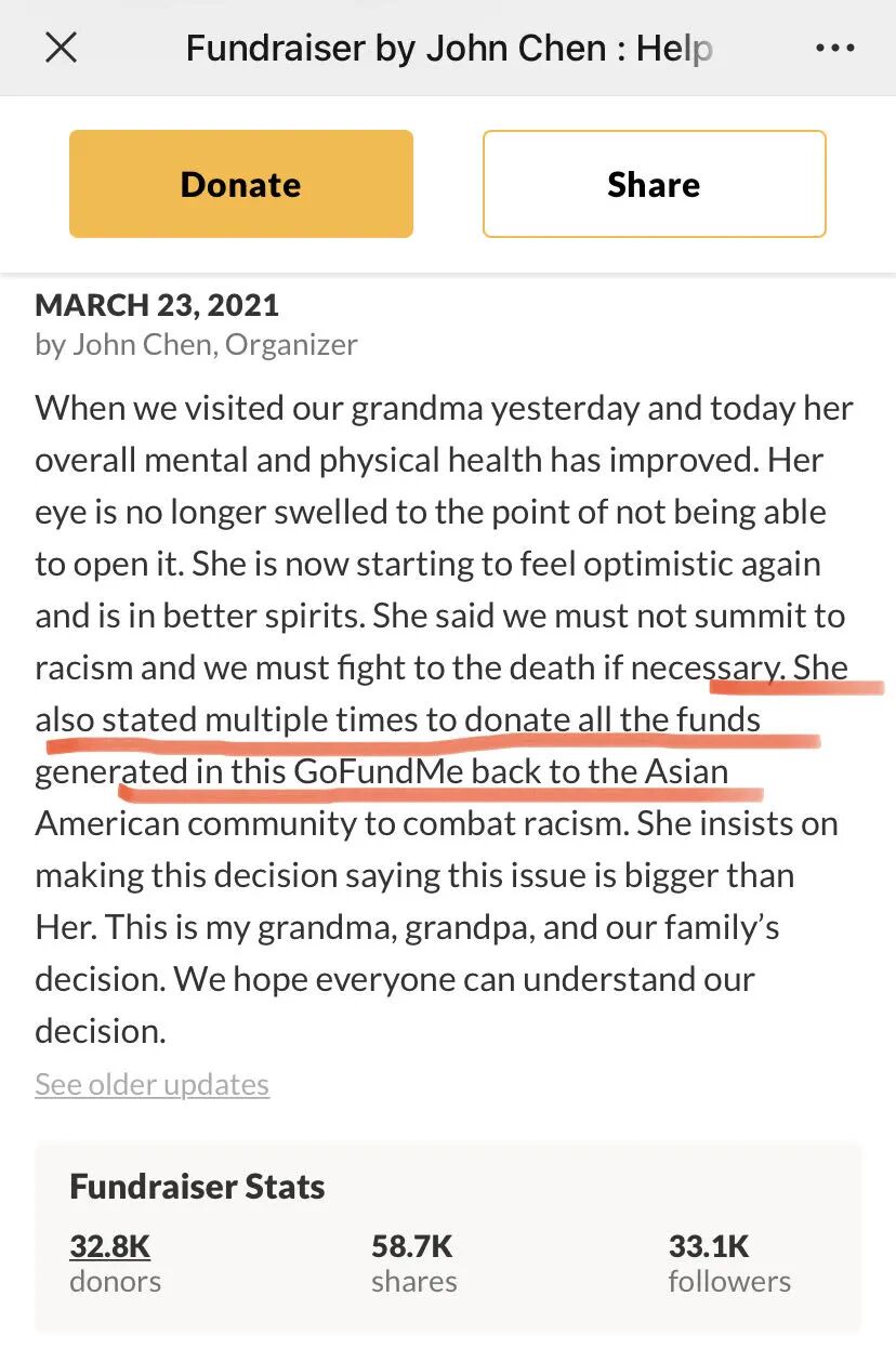 3月23日,老太太谢萧珍的外孙约翰·陈更新了Gofundme捐款的说明,表示将捐出所得筹款给AAPI组织。