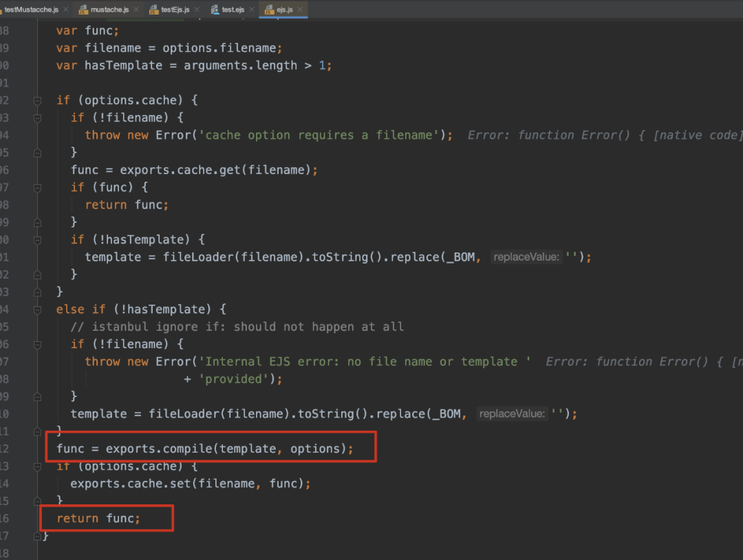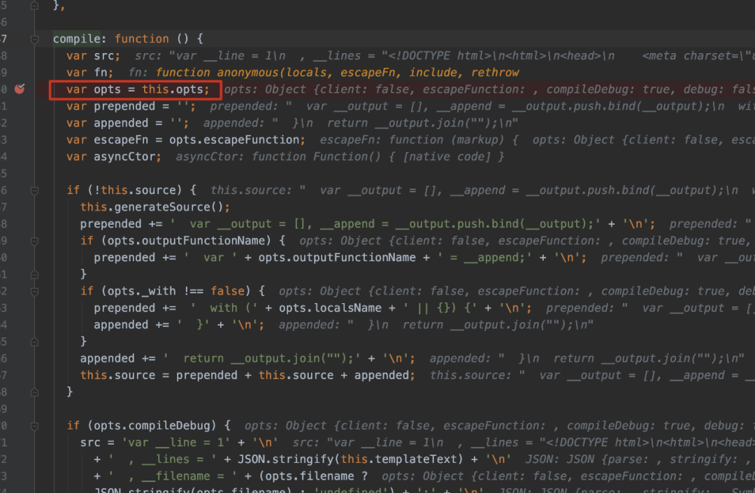 接下来继续跟进,可以看到在如下的代码中,compileDebug和filename都是我们可控的,并且最后filename也被直接拼接进匿名函数的代码中。