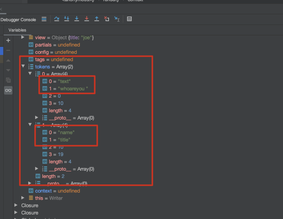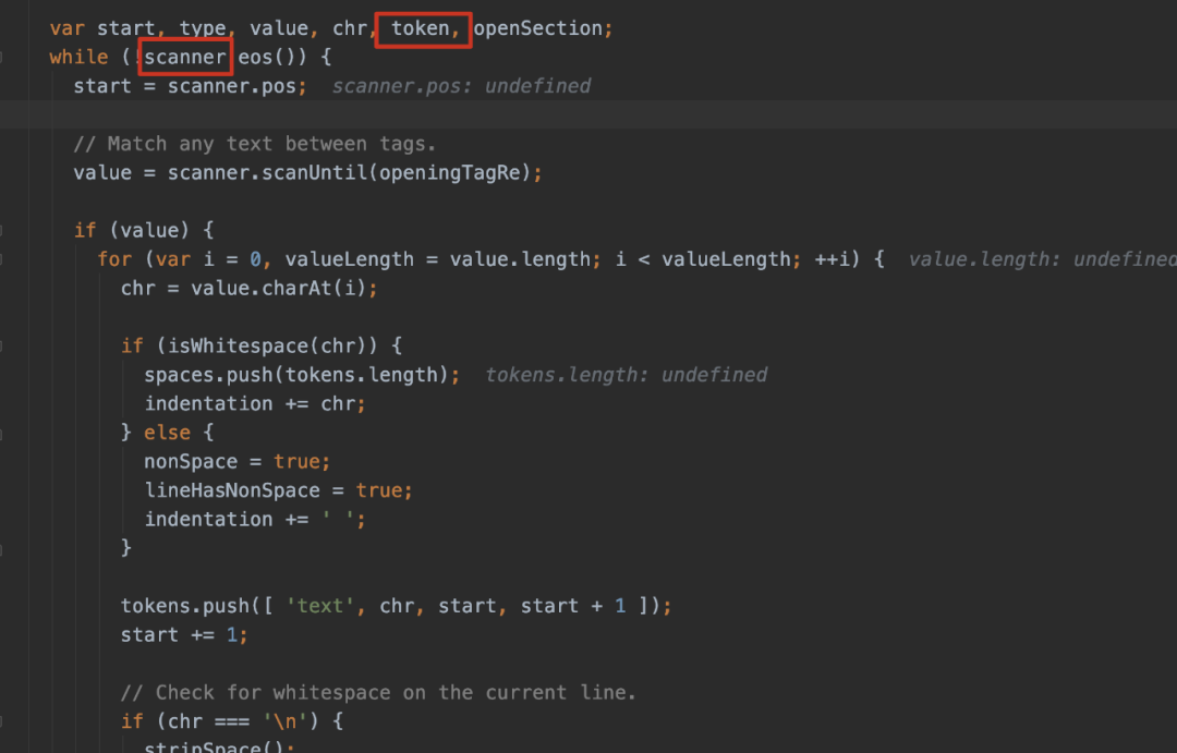 JavaScript let Mustache = require('mustache')let dataObject = {title : 'joe'}let output = Mustache.render('whoareyou {{title}}', dataObject);Mustache相应的定位代码如下,其中scanner负责对模板字符串进行扫描,扫描的结果为会存入多个token对象中。