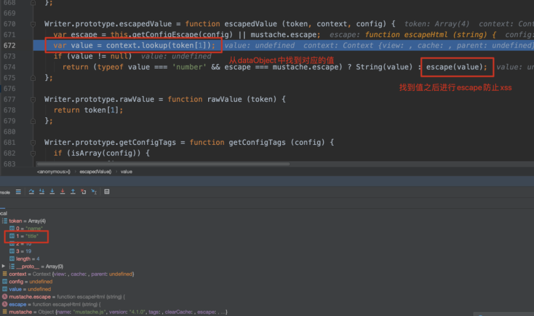 如上所示,如果检测到token为name类型,也就是要被替换的类型,则调用escapedValue函数,该函数中会调用lookup,根据token找到对应的值。