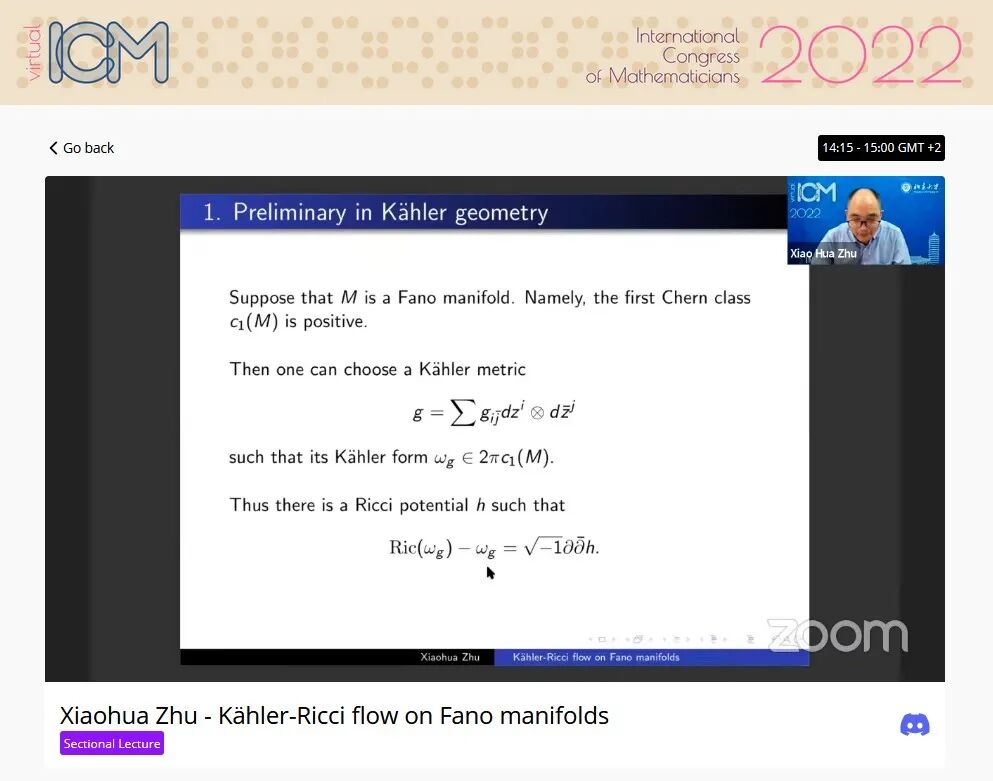 刘毅老师在本次国际数学家大会上作了题为 “Surface automorphisms and virtual homological eigenvalues”报告。刘毅在低维拓扑领域取得基础性突破,在合理的最广泛条件下确定了L2 Alexander挠率函数的存在性和连续性,工作所建立的一系列关键的估计技术在其他各种挠率型不变量的研究中有广泛的应用前景。他的工作还观察到新的数学现象,即L2 Alexander挠率函数的首项系数可能反映着某种双曲体积,引起同行的兴趣和进一步探索。 刘毅报告标题中的“庶几”大意为“几乎”,来源于英文“virtual”,描述了通过略去有限的信息来聚焦于更本质的信息的一类数学构造。而本届大会因线上召开,名称中同样含有“virtual”,可以理解为是“庶几”于面对面探讨数学。刘毅打趣说,“virtual icm 2022”意味着我们用网络空间代替现实空间来探讨数学,而研究庶几同调特征值问题则意味着我们用曲面的有限覆盖空间来研究曲面本身的特性。