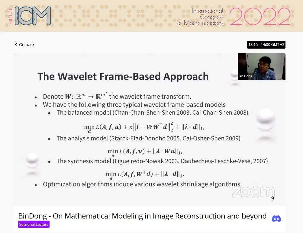 董彬老师在本次国际数学家大会上作了题为“On Mathematical Modeling in Image Reconstruction and beyond” 报告。在本次报告中,董彬首先简要介绍基于图像的科学发现和计算成像的概念。报告从一个生动的例子“运动中的马”出发,说明了科学发现在很大程度上依赖于视觉检验,而图像是必不可少的工具。董彬回顾两种流行的图像重建方法,即基于偏微分方程和基于小波框架的方法。一个关键的观察是小波函数的消失矩与微分算子的阶之间存在一定的对应关系,基于该观察,董彬将变分模型与小波框架的分析模型搭建了桥梁,并推导出了新的小波收缩算法和PDE模型。该系列工作也启发了董彬后续在深度学习中的研究,建立了深度神经网络和离散微分方程的联系,并由此诱导了新的网络构架,这些研究也逐渐发展出了一种机理与数据融合的算法设计模式,并应用于科学计算中的许多其他问题。