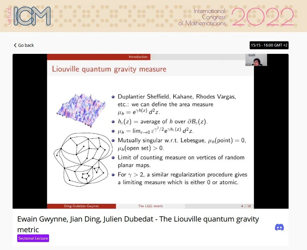 丁剑老师在本次国际数学家大会上作了题为“The Liouville quantum gravity metric” 报告。丁剑、Julien Dubedat,、Ewain Gwynne共同受邀完成了本次ICM报告。报告最先由丁剑简要介绍LQG。特别地,在γ=√8/3的情形,LQG曲面与Brownian map[2] 被Miller与Sheffield证明是等价的。丁剑接下来介绍了LQG曲面的Hausdorff维数, 在他与Gwynne,以及与Zeitouni、北大数院章复熹的文章中证明了维数的存在性,及其关于γ严格递增等若干良好性质。在这一系列工作中我们得到了关于维数相对较好的上下界,然而迄今为止所有关于维数具体表达式的猜想都被证明不成立。Watabiki的猜测被人们相信了许多年,然而丁剑与Goswami证明其至少在维数较低时是不成立的。丁剑与章复熹的文章中也指出了LQG的维数在更广泛的log-correlated fields大类中并不具备普适性。