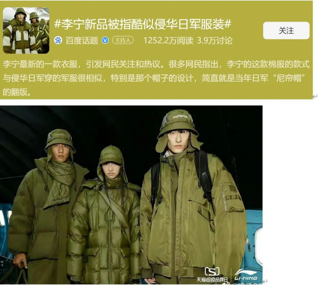 但就是这其中的某些衣服设计,引起舆论争议,部分人很反感,甚至连李宁集团执行董事钱炜的日籍身份都翻出来了。具体文字蜜妹就不详细说,大家看下图: