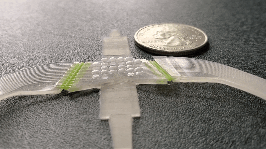 而为了控制这么多的新的软体执行器,Meta还为此开发出了号称是世界首款毫秒级微流体处理器 (Microfluidic Processor )用来控制气流,通过手套上的一个微小的微流体芯片,告诉阀门应该在何时以多大程度打开和关闭,从而控制输入执行器的气流。
