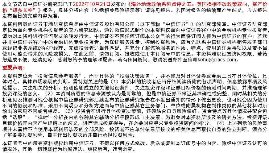 特拉斯推出的财政刺激政策引发英国债市及养老金市场巨震,股市及外汇市场亦明显下挫,其上任以来(截至10月20日)10年期国债、富时100指数、英镑汇价分别下跌约6.7%、4.7%和2.4%,而英国主权5年期CDS曲线则大涨约58.2%(均为区间整体值),与其经济政策的不确定性密切相关。短期来看,新首相就任及财政等部分政策转向可能致英国主要资产价格短时波动,但受制于美联储加息以及自身经济基本面的进一步恶化,未来半年主要资产价格走势或仍以偏空为主。