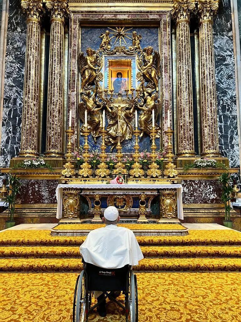抵达罗马后,教宗先到圣母大殿默默祈祷,感谢她的一路助佑……
