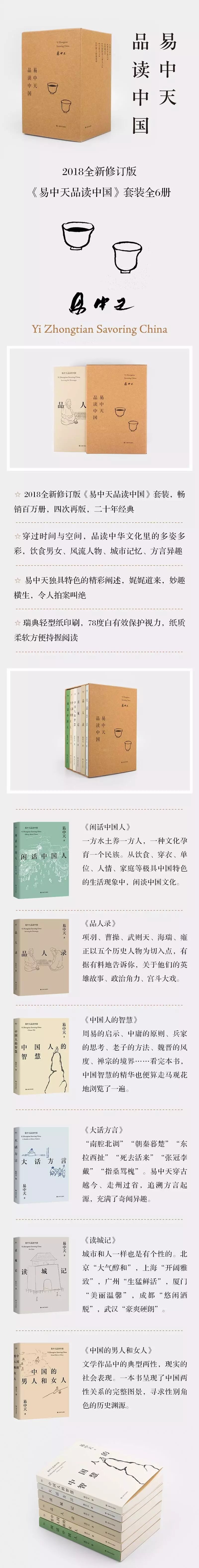 2018全新修订版《易中天品读中国套装》共有易中天著作六种:《闲话中国人》《品人录》《大话方言》《读城记》《中国的男人和女人》《中国人的智慧》。现已上架,六本合集,每一部都是满满的诚意。