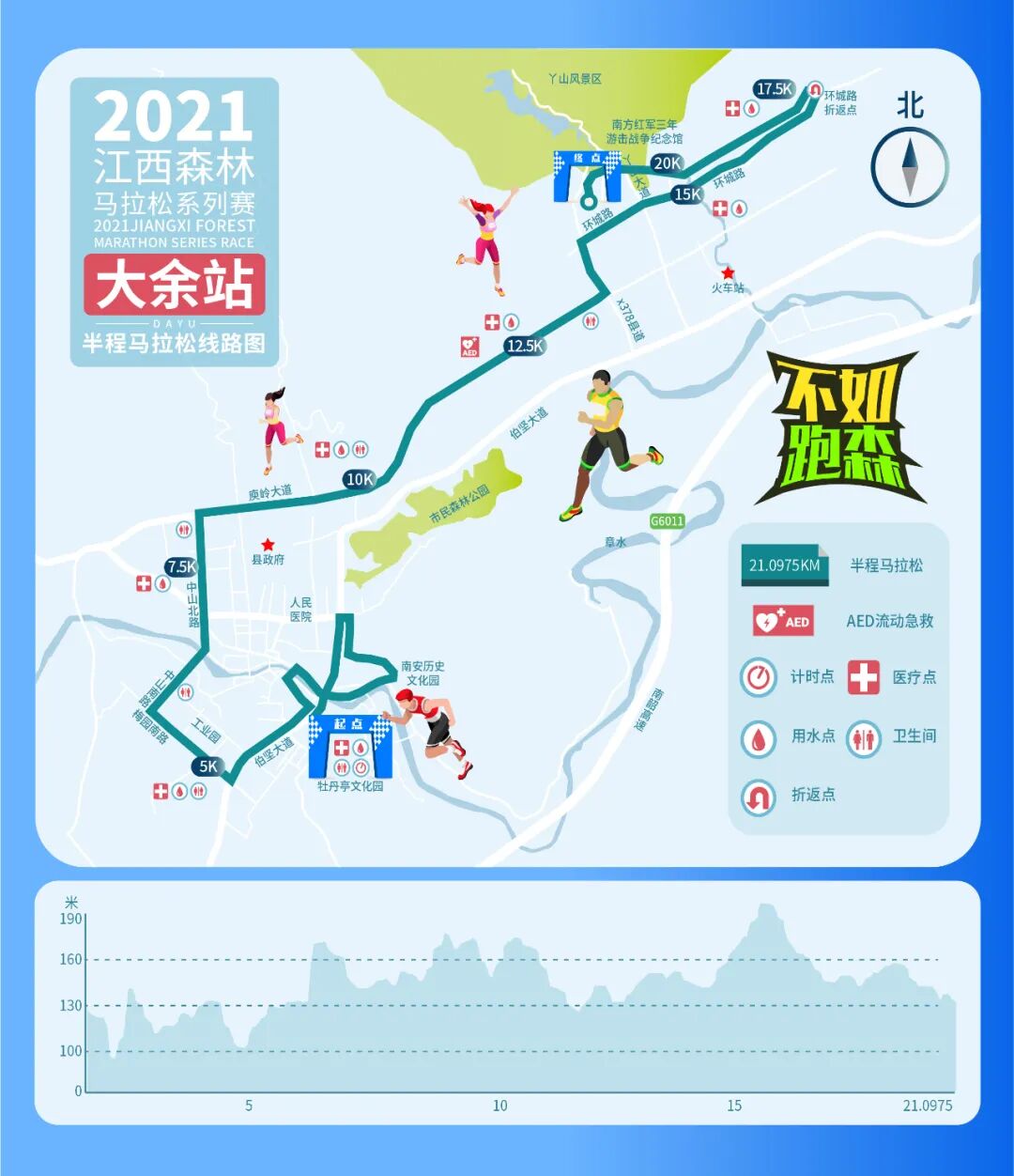 线路描述:【起点】牡丹亭文化园—南安历史文化园—县工业园—庾岭大道—环城路—(南方红军三年游击战争纪念馆)—【半马终点】县旅游集散中心—【换项区】—(石门口水库)—A哆乡村—A哆水寨—卧龙谷—兰香谷—道源书院—道源瀑布—贤达广场—丫山越野线路串联—灵岩古寺—大龙生态酒店—药泉谷—幸福天路栈道—丫山游客中心—南方红军三年游击战争纪念馆—烫皮小镇—【终点】县旅游集散中心