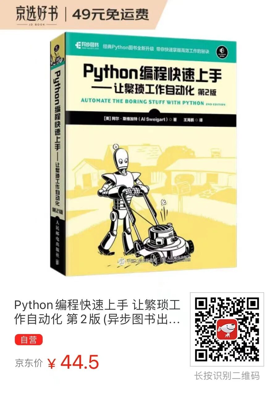 今天分享一本好书《Python编程快速上手 让繁琐工作自动化》,也是我自学python看过的第二本书。自学编程是不少人的选择,在著名的软件开发领域问答网站stackoverflow上,直接搜索learn programming可以得到47000多个回答,教我们如何学习某种编程语言或技术。▲ stackoverflow中关于学编程的搜索结果而对纯编程新手,亚马逊评分4.7,中文版热销超25万册的图书《Python编程快速上手 让繁琐工作自动化(第2版)》作者,阿尔•斯维加特给出了两个非常有效的自学建议:学会寻求帮助和聪明地提出编程问题。阿尔•斯维加特很诚恳地表示,这本书并不能让一个新手读者立马成为月薪6位数专业软件工程师。他认为编程是一个不断练习的过程,就像只学几节吉他课无法让人成为摇滚明星一样。这本《Python编程快速上手 让繁琐工作自动化 第2版》是为了帮助读者快速上手学会使用Python,将日常工作中那些需要计算机操作的繁琐工作自动化,比如:很明显,这些工作难度不大,但是会花费大量时间。掌握一些Python编程技巧之后,我们就能够编写对应的程序来轻松解决它们。作为真正的Python新手,可能之前从未接触过编程活动,也不知道如何下载安装Python。不过这些基础得不能再基础的内容,作者都在书中清晰、详细地向读者介绍了。并且在基础准备工作之外,他还向读者给出了两个学习本书的超好建议。作为新手要明确一个问题:在学习编程过程中遇到的错误信息或代码无法正常工作的情况,我们不会是第一个遇到这个问题的人,早有千千万万个人遇到过并总结了解决方法。所以,遇到问题第一时间去网上搜索答案,是在我们还不能对其进行思考时首先要做的事情。这不同于传统的向授课老师提问,而是互联网社区下的新型互动方式,正所谓互联网是免费的老师。作为新人我们既看不懂代码,也看不懂错误信息。不过没关系,直接复制错误信息到搜索引擎中,就能获取到非常多的结果。它们既解释了这条错误信息的含义,又说明了导致其产生的原因,还给出了有效解决方案。遇到不懂的,搜一下大概率就能解决问题,这比我们想象中的要简单。我们常会听人调侃道“你不会百度吗?”就是对这一寻求帮助方式的最好诠释——很多问题的解决方案都是现成的,很容易获取。有时候实在没有搜到相同的问题怎么办?去专业的问答社区提问!当然,提问也是有讲究,有章法的。既然是新人,有配套的视频一步一步手把手地教我们如何操作,是太好不过了!本书就配备了总共940分钟量身定制的教学视频,只要扫描书中章节对应的二维码或者直接在异步图书界面进入,就能观看讲解视频!作为以实践为驱动的编程技能,一边学习一边直接敲代码是非常直接有效的方式。本书就提供了在线编程环境,从e读版就能直接进入专属的个人编程练习环境!一边看书本内容,一边进行实际操作,跟着作者键入同样的内容,就能获得一样的结果。更直观地体验编程这一过程,从实践中加深对概念方法的理解。而且e读版电子书是买纸质书免费送!购买纸质书后输入图书唯一码,就能够领取e读版电子书啦。另外,还能加入社区学习,与其他读者共同讨论进步,老师在线答疑也能助你快速上手Python!书中全部源码同样可以在图书页面下载获取,通过对比源码与自己的代码,能够更快、更深地理解对应章节内容,掌握对应的方法技巧。的确,我们学习某个技能就是为了解决相应的问题,Python则是解决我们工作中那些繁琐任务的一个很好方式。而新人在学习Python过程中会遇到各式各样的问题,如何有效地寻求帮助很重要。《Python编程快速上手 让繁琐工作自动化 第2版》中给出的答案就非常有效,并且适用于编程的所有阶段,在任何时候使用这些方法去获取答案都是很好的。![]()