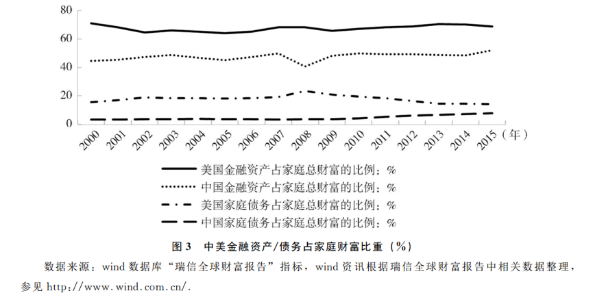 在个人和家庭方面,据国际货币基金组织预测,2016—2021年世界总体和发达经济体国民总储蓄率增速都将放缓,新兴市场和发展中经济体国民总储蓄率甚至不会增长。2014年全球成年人人均金融财富为33659美元,占当年人均财富的65%。美国家庭金融资产占家庭总财富的比例由金融危机后2009年的65.9%,上升至2013年的70.7%。美国家庭债务占家庭总财富比例在2008年一度达到23.4%。中国金融资产占家庭总财富的比例也由2000年的44.7%上升到2015年的52.1%。中国家庭债务占家庭总财富比例自2000以来呈稳步上升趋势,2015年达到最高,为7.9%(见图3)。