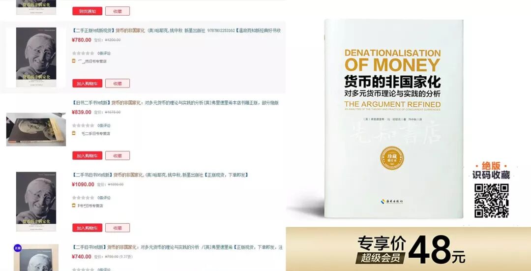 本书曾一度绝版,10年前的第一版的二手书价曾高达千元。目前,先知书店深知此价值联合出版社复合(独家珍藏版售价69元,会员价48元,新会员还可使用优惠券,首单仅需38元)哈耶克关于货币的六大洞见