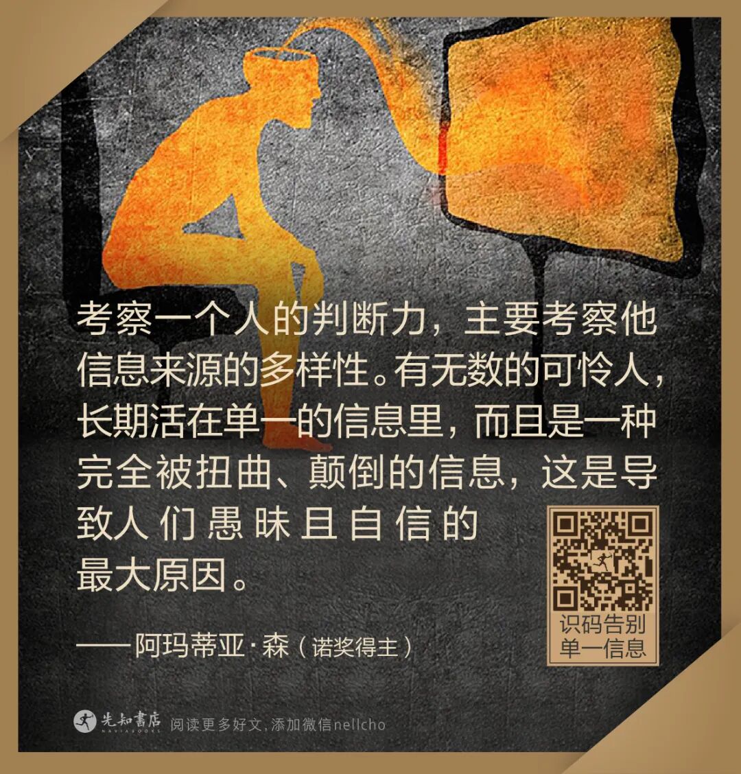 考察一个人的判断力,主要考察他信息来源的多样性。有无数的可怜人,长期生活在单一的信息里,而且是一种完全被扭曲的,颠倒的信息。这是导致人们愚昧且自信的最大原因。——-阿玛蒂亚森