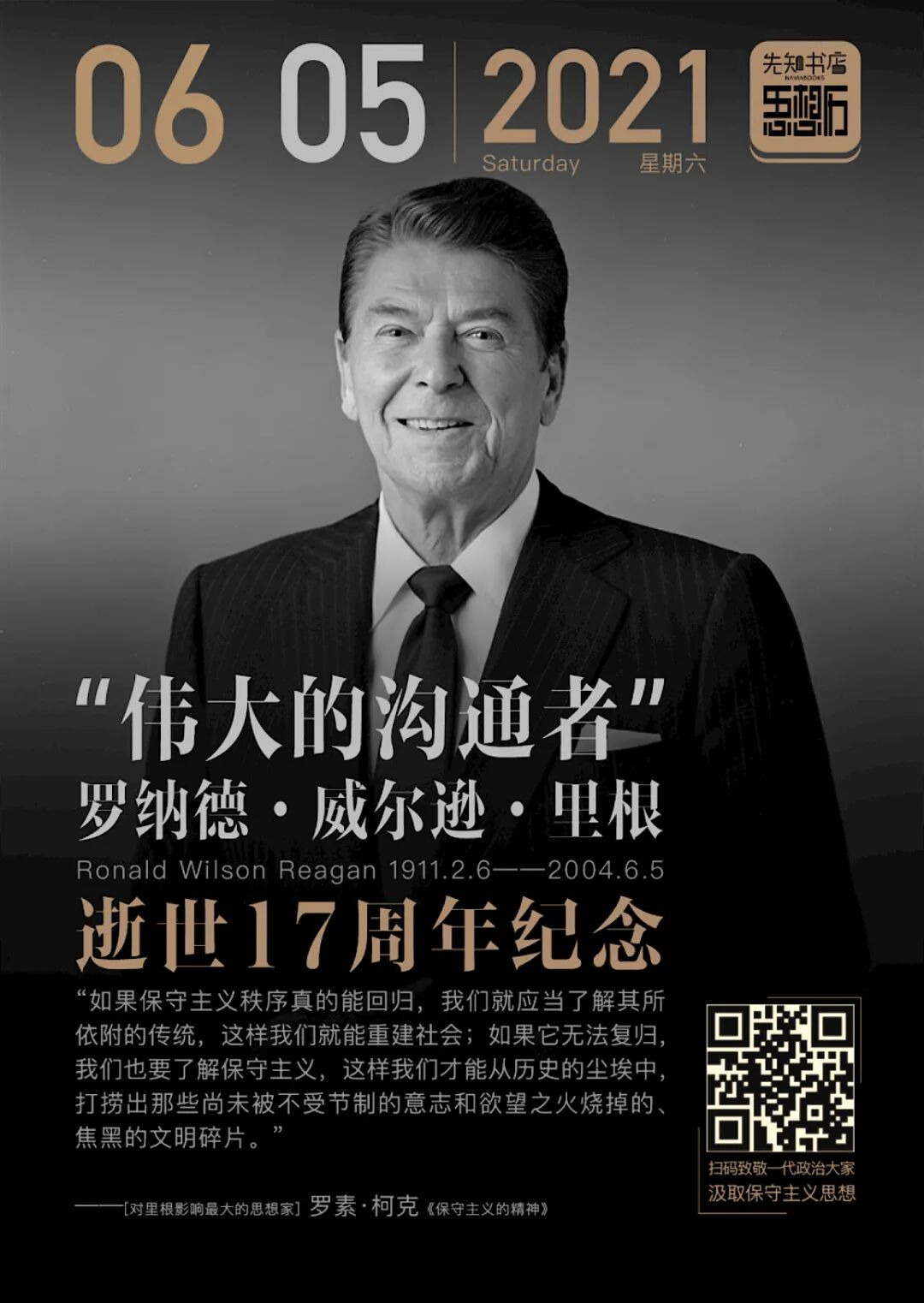 里根的思想观念,深受美国著名保守主义思想家柯克的影响,柯克的作品,是里根推崇的必读书目。