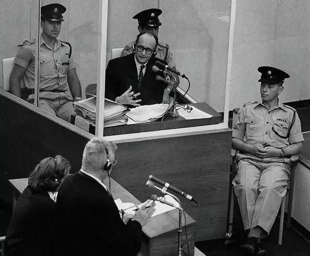 一个臭名昭著的纳粹战犯,屠杀了580万犹太人,双手却没有鲜血。他肆无忌惮地宣称:“我会笑哈哈地跳进我的坟墓,因为一想到我已经处理掉500万犹太人,我就感到到极大的满足。”这名“纳粹刽子手”,官阶并不高,只做到中校。但他的工作是,负责执行彻底消灭犹太人的“最终方案”。他就是艾希曼。在艾希曼的组织下,整个欧洲的犹太人被运送、收容,最后被集体屠杀;在艾希曼的监督下,奥斯维辛集中营如同一条高效的生产线:每天杀害12000人。战争结束后,艾希曼被美军俘虏,但之后逃脱。经过漫长的逃亡,他流亡到阿根廷。1960年,以色列情报特务局查出艾希曼的下落,将其绑架,并秘密运至以色列。1961年4月11日,艾希曼于耶路撒冷受审,起诉罪名为“反人道罪”等十五条。1962年5月31日夜,艾希曼被执行绞刑,这也是以色列唯一的一次死刑。得知艾希曼在耶路撒冷受审后,阿伦特向《纽约客》杂志主动请缨,亲临耶路撒冷的艾希曼审判现场进行报道。出发前,阿伦特在给洛克菲勒基金会的信中写道:“你会理解我为什么要报道这次审判,我没能亲眼见证纽伦堡审判,我从来没有见过那些人活生生的是什么样子,这也是我唯一的机会了。”阿伦特在法庭上见到的”活生生“的纳粹战犯是什么样的呢?“他中等身材,体形较瘦,四五十岁的样子,前脑门半秃,牙齿不太好,近视眼,脖子干瘦。整个审判过程中,他一直朝法官席的方向探着脖子(从未面向观众)。”