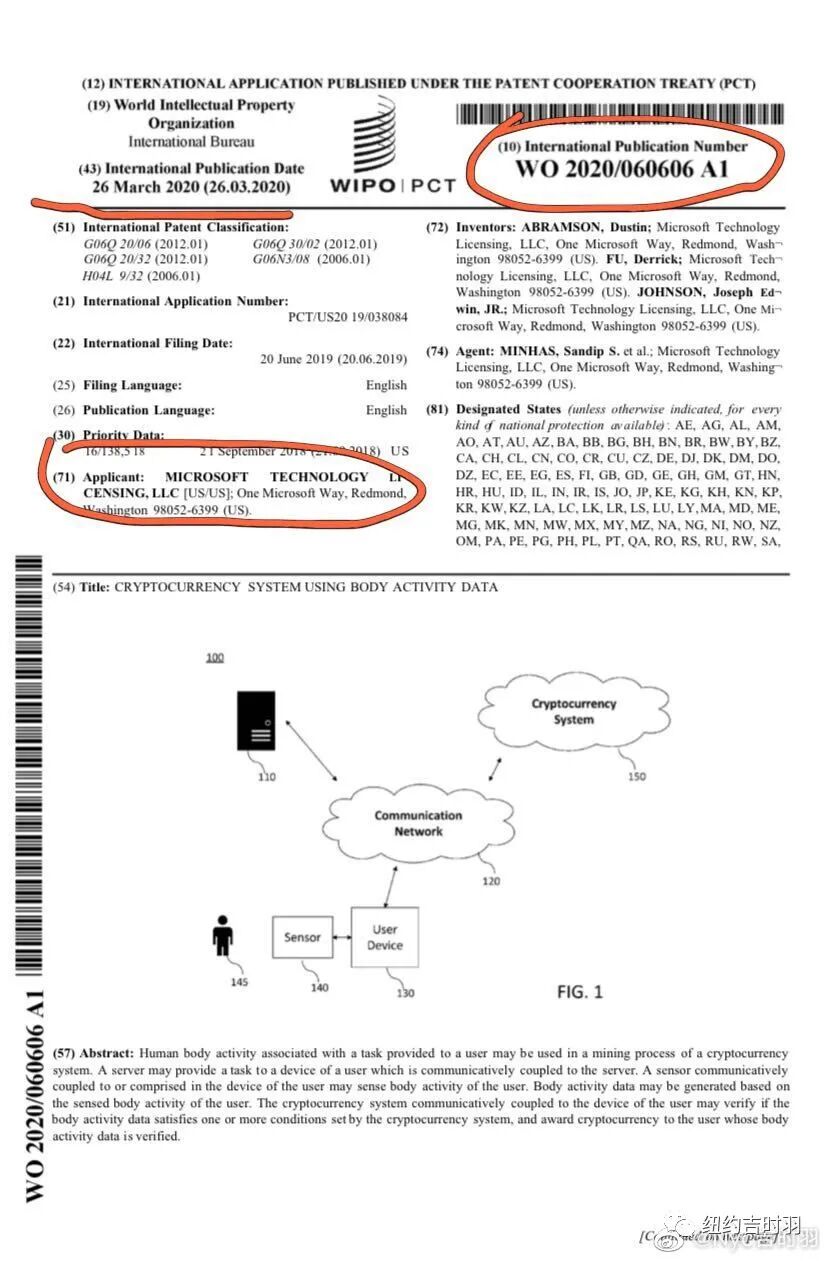 2020年3月26日,微软申请了人体植入式微芯片技术专利,专利名称是Cryptocurrency system using body activity data,专利号WO2020060606A1。