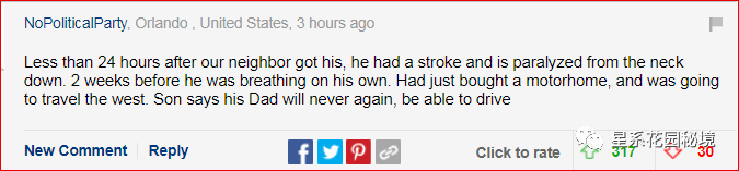 我的邻居注射这玩意后不到24小时,他就中风了,脖子以下瘫痪了。两周后他才开始独立呼吸。他刚买了一辆房车,打算去西部旅行。他儿子说这位父亲再也不会开车了…