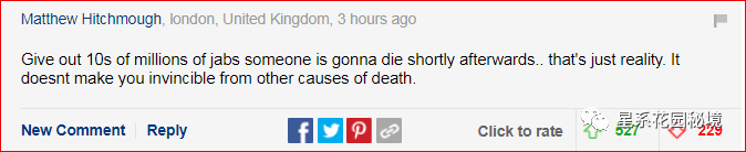 2月8日,英语媒体开始报道美国各地注射辉瑞疫苗迅速死亡的案例…虽然官方极力声称“这些死亡和疫苗无关”,但评论区完全被淹没了……每日邮报新闻下的评论区在一个小时内收获了超过1800条争议,看来英国人民还是在关注自己上天国之前的命运了。