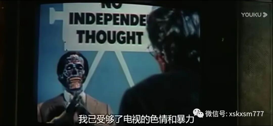 后来男主角在这个社区生活的时候,总是能够看见电视机上会突然跳闸出来一个老爷爷总是在那里号召大家看清生活真相。