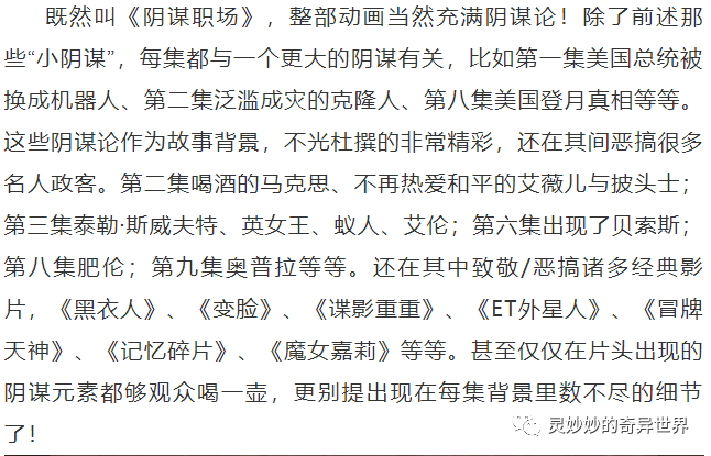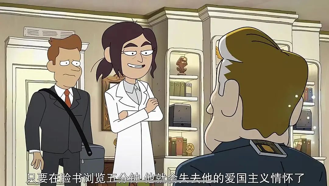好的。是不是非常大胆,非常崩坏,非常低俗,但是仔细一想好像又……以上这些内容,都来自于最近网飞的一部成人向动画《阴谋职场》。所以实在忍不住想要将这样一部宝藏作品推荐给大家了!!!相信我,无论你最近需要的是下饭剧、解压剧、还是成人档深夜档喜剧……《阴谋职场》都可以完美地满足你的需求。而之所以《阴谋职场》会得到一个这样的高分,主要是因为:这部剧的脑洞,实在是,太大了。例如上面提到的,这个世界真正的统治者是一个神秘的暗影议会。而站在金字塔顶尖的各种社会名流,可能都是隐藏的蜥蜴人。控制美国政府、伪造登月计划、监控全世界、克隆无数个肯尼迪。所以这部剧好玩的地方就在于,从另一个角度来看,《阴谋职场》其实也是一部职场剧,并且完全兼具某种办公室情景喜剧式的幽默感。而他们的小领导,就是本剧的女主角,一个孤僻、强势、死宅、事业狂的三十岁女科学家。她的业务能力强大到,她可以制作出一个完美的机器人来取代美国总统。但与此同时,她的死宅力也夸张到,需要制作出另一个机器人来跟自己谈恋爱。由于这位女科学家完全不擅长和任何人类打交道,所以,她的领导又为她安排了另一个男搭档。也就是本剧的男主角,一个来自上流社会,毕业于耶鲁大学,加入了神秘的兄弟会,有八颗牙齿、八块腹肌的白人精英男。除了会露出迷人的微笑之外,他可以说是一无所长。之所以会得到这个超厉害的职务,纯粹是因为他“握手的姿势非常有力”。相信看到这里,你已经感受到了《阴谋职场》讽刺意味满满的设计:这个办公室里囊括了黑人、白人、黄种人、外星人、甚至是海豚人(虽然我严重怀疑这是个鲨鱼头)。但与此同时,他们也是一群死宅、瘾君子、暴力狂、社交强迫症……看到这里其实你已经可以想象,当这些人凑在一起的时候,他们的办公室每天会是怎样一副鸡飞狗跳的画面。在最开始的几集里,阴谋办公室基本上都在忙于解决各种莫名其妙的突发状况。但她没想到这个机器人因为过于爱国,引发了情绪错乱,他决定要代表美国向全世界宣战。为了让他不再爱国,女主角决定让他上网看一眼脸书和推特。(感受到笑点了吗)另一集里,女主角从培养基里释放了一个肯尼迪总统的克隆人。她同样没有想到的是,这个肯尼迪克隆人释放了整层楼所有的肯尼迪克隆人。他们大喊着肯尼迪的名言“我宣布”,横扫整栋办公大楼。