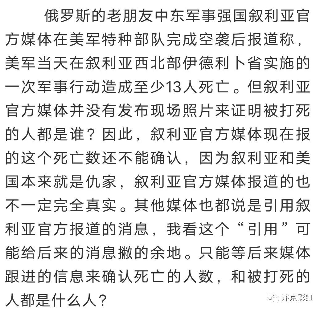 事发后我写了一篇文章,分析叙利亚媒体所说美国美军无人机轰炸“导致13人死亡,其中包括六名儿童和三名妇女”。看我写东西是不是很客观?我压根都不相信叙利亚媒体报道的无人机造成死亡数据中六名儿童三名妇女是真的。不做事后诸葛亮,只要客观去思考,就不会有错,我在文章中都没有写儿童和妇女,就是怕第一个新闻带偏,因为我分析到后来肯定不会是这个样子。(下方文字是我当天文章内容,看分析的对不对?)