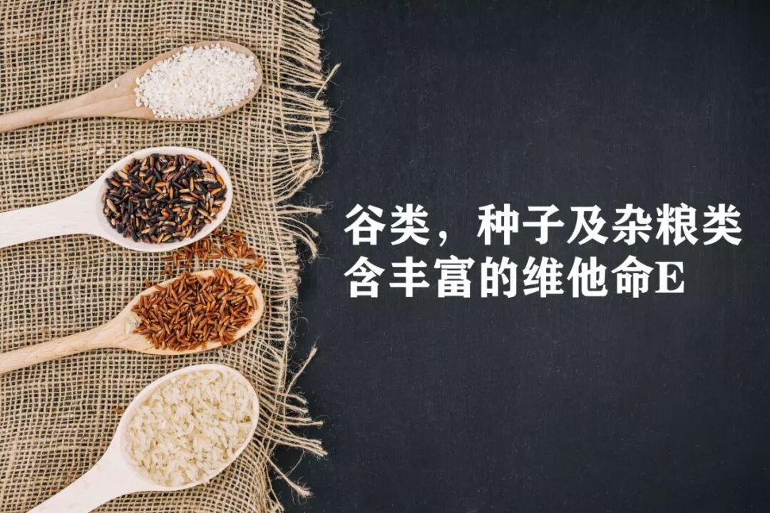 谷类, 种子及杂粮类:含丰富的维他命E。研究显示,人体血液中维他命E含量高,得癌症的机率会降低。维他命E 能有效起到预防肺癌和乳癌的功效。谷类的纤维素更益于维护肠道健康,增进肠胃蠕动及食物消化,分解含有毒素的胆酸、胆固醇、及代谢物等,有效预防胃癌和结肠癌的产生。