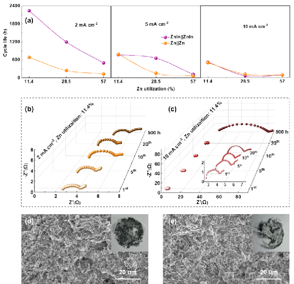 进一步对Zn||Zn和 ZnIn||ZnIn对称电池进行不同条件下的恒电流测试,以评估不同电流密度和锌利用率下ZnIn复合负极的有效性。初始锌负极的循环寿命与电流密度和锌利用率高度相关,电池寿命随锌利用率的增加而逐渐降低。ZnIn复合电极在相对较低的电流密度(< 5 mA cm-2)和面容量(< 5 mAh cm-2)条件下可以有效地延长初始锌负极的循环寿命,在高电流密度和高锌利用率下的性能提升几乎可以忽略不计(图3a)。EIS结果显示,当锌利用率为11.4%时,ZnIn复合电极在2 mA cm-2电流密度下循环500 h后的界面阻抗依然很小,而在10 mA cm-2电流密度下循环500 h后的界面阻抗急剧增加(图3b,c)。说明在大电流密度条件下,ZnIn电极经过长期循环后界面反应动力学恶化。SEM结果显示ZnIn电极在2 mA cm-2, 10 mAh cm-2 和 10 mA cm-2, 2 mAh cm-2下循环500 h后,极片都发生了严重的破坏,表面结构不均匀且腐蚀严重(图3d,e),说明不均匀的锌沉积-溶解造成的结构变化可能是导致ZnIn复合电极在高利用率和大电流下性能衰减的主要原因。因此,构建稳定兼容的ZnIn电极表面保护层对于维持复合电极的结构稳定性,以及提高大电流和高锌利用率下的沉积均匀性至关重要。