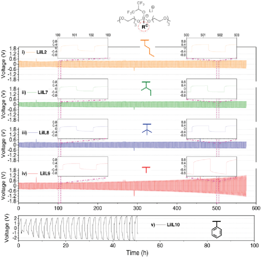LiIL2、LiIL7和LiIL8 电解质发生明显氧化,阳极电流急剧增加。4.7、4.9和5.2 V(vs Li/Li+)分别对应于它们的乙二醇链和阴离子中心共存的氧化。LiIL2、LiIL7和LiIL8归因于阴离子中心负电荷的离域增加,这为硼酸盐阴离子提供了更高的氧化稳定性。LiIL9和LiIL10电解质也表现出类似的行为,其中电流曲线似乎没有显示出典型的电流指数增长。