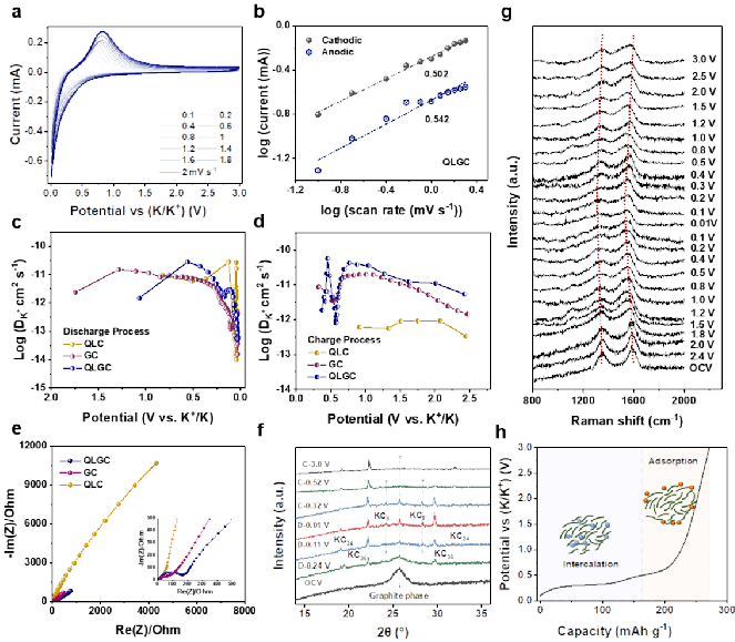【研究背景】钾离子电池(PIBs)具有钾资源丰度高、氧化还原电位低(E0K+/K=-2.93 V vs E0Li+/Li=-3.04 V)等优点,可以替代LIBs在中/大规模能源存储系统中的应用。基于与锂离子电池(LIBs)类似的工作机制,钾离子可以在石墨中形成稳定的钾-石墨插层化合物(K-GICs,以KC8的形式),表现较高的理论容量(279 mAh g-1)和较低的插层电位(~0.1 V)。然而,大尺寸的钾离子在插入石墨晶格时会引起61%的碳层体积膨胀,此外,有限的石墨层间间距(3.35 Å)抑制了钾离子的固态扩散动力学,导致循环稳定性和倍率性能较差。硬炭凭借其大层间间距(> 3.6 Å)和短程碳层的特性可以承受钾离子插层引起的体积膨胀,适用于钾离子的可逆插层。然而,硬炭中的湍层结构不利于钾离子快速脱嵌,表现低容量和高极化的弊端。并且,硬炭在储钾中主要表现倾斜的充放电曲线和高的电位滞后(0.40-0.55V,充放电曲线一半容量所对应的电势差),不利于构建高能量密度的储能器件。在无定形炭中引入适当的石墨纳米域并保持大的层间间距将利于钾离子快速而稳定的存储。其中,石墨纳米域能够改善钾离子的插层行为,提高低电位平台容量;扩大的层间间距可以缓冲碳层体积膨胀,促进钾离子稳定存储。虽然通过控制碳化温度可以获得具有局部石墨纳米域的硬炭材料,而高温也会诱导生成封闭畴,缩小层间间距,极大影响钾离子的存储效率。为此,我们以共建局部石墨域和大层间间距的无定形炭结构角度出发,研究了石墨域和碳层间距对硬炭材料储钾性能的影响。 【工作介绍】近日,广东工业大学邱学青、张文礼教授团队提出了一种基于氧化石墨烯诱导硬炭局部石墨化的策略。凭借胺化木质素和氧化石墨烯之间的静电引力进行组装,碳化过程中少量的氧化石墨烯即可促进硬炭发生局部石墨化,同时保持硬炭中非晶态区的较大层间距。基于此策略,我们可以实现由局部石墨域提供的丰富插层位点和大层间间距提供的快速钾离子传输通路,优化后的硬炭负极表现了低电位滞后和高低电位平台容量。异位/原位电化学测试证明了局部石墨域对于稳定钾离子存储的重要性。本项工作为开发具有局部石墨域的在硬炭负极材料提供了一种思路。该文章发表在Advanced Functional Materials上。 【内容表述】石墨结构可以为钾离子提供插层位点,但石墨晶格易破坏;无定形炭结构的大层间间距可以缓冲碳层体积膨胀,但湍层结构阻碍钾离子快速传输。为了实现无定形炭中局部石墨纳米域的构建,前驱体的设计尤为重要。本文以表面带正电的胺化木质素(QAL)为硬炭前驱体,表面带负电的氧化石墨烯(GO)为模板,两者经过静电引力均匀分散、组装,抑制QAL和GO分子的聚集。热解过程中,QAL/GO组装体的形成保护了石墨结构,诱导了无定形炭中局部石墨纳米域的生长,获得了局部石墨域和大层间间距共存的硬炭。 胺化木质素(QAL)与氧化石墨烯(GO)通过静电引力组装,抑制QAL和GO分子的聚集。在热解过程中,QAL/GO组装体的热稳定性提高,石墨结构得到保护,并诱导了无定形炭中局部石墨纳米域的生长,获得了局部石墨域和大层间间距共存的硬炭(QLGC)。Figure 1. Schematic illustration of the synthesis process for QLGC. 在木质素直接热解产生的硬炭中,因sp2团簇被无定形区中的sp3杂化碳严重交联,抑制了长程有序结构的形成。GO中大量C-O键的裂解导致其热解衍生炭中的碳层发生交联,类似硬炭结构,不利于钾离子的扩散。而对于QLGC,木质素和GO之间的静电吸引效应使两者均匀分散、组装。在碳化过程中,外部的石墨晶格可以作为晶格模板用来减少吉布斯自由能垒,有助于打破QLGC中sp2和sp3团簇之间的C-C键交联。由此,sp2杂化碳可以自由移动至石墨相,并重排列成石墨晶格。因此,GO的引入有利于在硬炭中发展了有序的石墨晶格结构(0.34 nm晶格间距),且与QLGC的无序区域连接。Figure 2. Micromorphology characteristics. SEM images of (a-b) QLC, (e-f) GC, and (i-g) QLGC; TEM images of (c) QLC, (g) GC, and (k) QLGC; HRTEM images of (d) QLC, (h) GC, and (l) QLGC; EDS mappings of (m-p) QLGC. 为了进一步识别硬炭中的微观结构,对XRD、Raman和C 1s XPS谱图进行了拟合分峰。QLGC中主要包含三种碳结构类型:高度无序、伪石墨域和类石墨微晶。这表明了GO在QLGC前驱体中可以诱导其碳基质(QAL)发生部分石墨化。硬炭中具有无序的涡旋纳米域和扩大的层间距离(0.37-0.42 nm),确保了大尺寸钾离子的快速传输。发展良好的石墨微晶为钾离子提供了快速的扩散通道。所述结构将利于钾离子快速而稳定的插入石墨层间。Figure 3. Characterization of QLC, GC, and QLGC. a) XRD patterns; b) Raman spectra; c) XPS survey and d) high-resolution C 1s XPS spectra. QLGC中的微晶石墨域允许大量钾离子插入,显著的氧化还原峰与低电压平台曲线是最直观的证据。经统计,QLGC在0.05 A g−1的电流密度下表现出272 mAh g-1的高质量比容量和60.3%的平台(< 0.5 V)容量贡献以及较低的电压滞后(0.35 V)。另外,QLGC中的较大层间间距使其保持了稳定的碳层结构,表现了优异的倍率性能和循环稳定性。与QLC、GC以及商业石墨相比,QLGC均表现出优越的钾离子存储性能。Figure 4. Electrochemical performance characterization. a) CV profiles; b) GCD curves of QLGC at current densities of 50-5000 mA g−1. c) dQ/dV profiles of QLGC; d) Capacity contribution distribution upon potential; e) Potential hysteresis of the hard carbon samples; f) Rate performances; g) Capacities and rate capabilities compared be