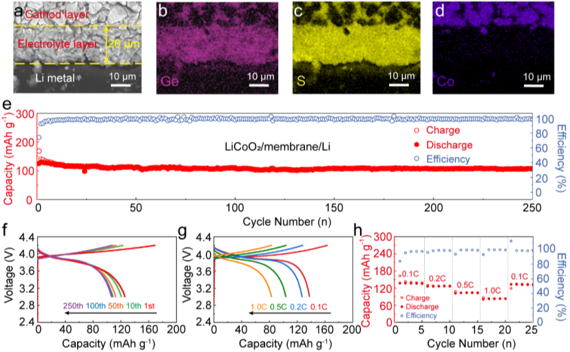 图3. 硫化物电解质在全固态锂电池中的应用 (a) 全固态锂电池的截面SEM图和 (b-d) EDS表征,Li| Li9.88GeP1.96Sb0.04S11.88Cl0.12膜|LiCoO2电池在0.1C、60℃下的 (e) 循环性能曲线和 (f) 充放电曲线图以及倍率 (g) 充放电曲线和 (h) 性能图。