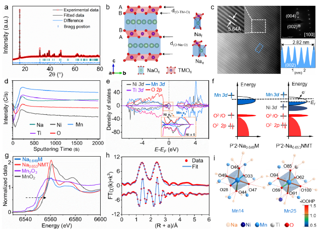 Figure 1. 结构分析。(a) P’2-Na0.653NMT的XRD图谱和精修;(b) P'2型结构;(c) HADDF-STEM图像,电子衍射图案和(002)晶面的晶格间距;(d) SIMS图谱;(e) P’2-Na0.653NMT的DOS;(f) P'2-Na0.653NMT和P'2-Na0.649M的电子结构和(g)XANES光谱;(h) P'2-Na0.653NMT的Mn K边EXAFS和在R空间的拟合;(i) P'2-Na0.653NMT和P'2-Na0.649M的COHP分析。