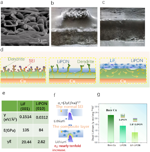 图1 (a)通过Ag/LiPON(189nm)/Ag结构测得能斯特曲线 (b)通过Ag/LiF-LiPON(220nm)/Ag结构测得能斯特曲线 (c)拟合结果分析 (d)锂离子传输能垒计算。作者采用高分辨透射电镜观察LiF-LiPON复合人工SEI中的结构信息。直观可见,氟化锂纳米微晶紧密的镶嵌在非晶LiPON基质中,复合材料整体上均匀且致密(图2a-e)。膜层在浸泡电解液48h后仍可保持稳定的结构(图2f),表明了薄膜具有良好的化学稳定性,这奠定了其在无负极锂电池中的应用基础。TOF-SIMs深度剖析验证了氟化锂微晶在整个膜层中均匀分布,表明了薄膜整体上成分均匀(图2g)。而通过纳米压痕法测得复合薄膜的杨氏模量为90 GPa(图2g),高于单相LiPON(84GPa),暗示着薄膜具有更强的能力去容纳高面容量时的锂体积形变。理论模拟复合薄膜的受力情况,结果显示,在受到外部应力时,复合膜的内应力主要由断裂韧性更强的氟化锂微晶承受,因此相比单相LiPON,该膜层具有更好的机械稳定性。(图2h)图2 (a-e) 复合薄膜的高分辨透射电镜分析 (f)复合薄膜在浸泡电解液48h后的透射电镜图 (g)复合薄膜的TOF-SIMS深度分析结构 (h)纳米压痕法测试薄膜杨氏模量的力曲线 (i)理论模拟受力分析。该人工SEI在实际应用时,抵御枝晶穿刺的效果显著。在沉积1mAh cm-2的锂金属时,没有人工SEI的金属锂呈现无序的枝晶装散乱生长,使用LiPON作为人工SEI时,一定程度上可改善锂沉积,但是并不能有效阻止枝晶的穿刺,图3b展现出来了典型的枝晶刺破薄膜后的生长形貌。而应用复合薄膜的金属锂整体上呈现均匀且致密的沉积。根据格里菲斯脆性断裂理论,决定材料断裂韧性的临界应力σc,与材料的杨氏模量E以及表面能γ成正比。作者用两者乘积γE分别衡量了LiF和LiPON的断裂韧性,根据计算结果,将氟化锂引入LiPON后,人工SEI的微区断裂韧性可有效提升近10倍。这就是在同样沉积面容量的情况下,使用该SEI可以保持结构稳定,抵御枝晶穿刺,保障金属锂均匀稳定沉积的重要原因。经质谱滴定验证,Li-Cu电池经过15个周期循环,就死锂量而言,裸铜以及LiPON修饰的集流体均明显高于LiF-LiPON人工SEI所修饰的集流体(图3g),揭示了该人工SEI材料具有维持稳定界面、抵御枝晶穿刺的强大功能。图3 不同情况下电沉积锂金属的典型扫描电镜图像Cu (a), LiPON/Cu (b),和LiF-LiPON/Cu (1 mAh cm-2)。(d)锂在裸Cu、LiPON/Cu和LiF-LiPON/Cu电极上的电沉积行为示意图。(e)LiF和LiPON的表面能和E的计算结果。(f)正常SEI和LiF-LiPON人工SEI的枝晶抑制能力示意图。(g) Cu,LiPON/Cu和LiF-LiPON/Cu电极在Li/Cu电池中经过15次循环后集流体上残留的死锂量比较。图4a显示了Li-Cu电池(2.5 mAh cm-2)的长循环稳定性差异。使用裸铜集流体的电池循环75次稳定性恶化。然而,使用LiF-LiPON人工SEI修饰的Li-Cu表现出优异的循环稳定性,达到320次稳定循环,CE高达98.8% (3000 h),循环性能远优于裸铜和LiPON改性Li-Cu电池。图4b显示了使用人工SEI后锂铜半电池第100、200、300个循环时锂沉积/剥离的电压分布保持稳定,极化小。基于LFP正极(载量为13.3 mg cm-2)和LiF-LiPON/Cu集流体的高能量密度无负极全电池经过100次循环,能保留66%容量保持率(无修饰Cu为25%)。此外,采NCA电极(活性物质载量为23 mg cm-2)组装的无负极全电池在应用人工SEI后循环稳定性也得到了显著提高,50次循环后容量保持率从26%提高到65%,再次验证了LiF-LiPON人工SEI的强大效果(图4d)。图4 (a)锂/铜和Li/LiF-LiPON包覆Cu半电池的库仑效率对比(2.5 mAh cm-2)。(b) Li/Cu (LiF-LiPON修饰层的Cu)半电池在不同周期下的电压区域容量分布。(c)无负极全电池(LFP-Cu)分别应用裸铜和Li/LiF-LiPON修饰铜的循环性能。插图: 电池能量密度对比示意图。(d) 裸铜和Li/LiF-LiPON包覆Cu无负极(NCA-Cu)全电池的循环性能。作者采用磁控共溅射技术,将LiF纳米晶体密嵌入到LiPON基质中,构建了一种集成的LiF-LiPON复合材料,一步实现了人工SEI的高离子导电性和强机械稳定性。与单相LiPON相比,受益于引入的LiF,LiF-LiPON一体化复合薄膜的微区断裂韧性提高了10倍。此外,所构建的一体化结构开辟了新的低能垒离子扩散路径,克服了LiF块体离子电导率差的问题,使薄膜具有更好的离子电导率。将人工SEI应用在无负极锂金属电池中时,强化的SEI能在循环过程中保持非常稳定的界面和均匀的锂沉积,使得AFMLB具有显著提高的库伦效率和循环稳定性。这项工作证实了SEI断裂韧性在决定AFLMBs寿命方面的重要性,展示了一种基于Griffith理论的新型人工SEI,并为长循环高能量密度AFLMBs设计复合型人工SEI提供了新的研究思路。Jinran Sun, Shu Zhang, Jiedong Li, Bin Xie, Jun Ma, Shanmu Dong* and Guanglei Cui*, Robust transport: an artificial SEI design for anode free lithium metal battery,Advanced Materials, DOI: 10.1002/adma.202209404https://doi.org/10.1002/adma.2022094042023年1月7日,Next系列期刊Next Energy将在能源学人成立6周年年会上首次亮相,欢迎关注!![]()