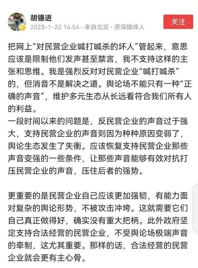 当日胡锡进也发声了,沿袭了一贯的「虽然……确实存在部分……但是……最后老胡呼吁……」的胡锡进体风格,和了一把稀泥,称「关键是民营自己要有不为舆论左右的韧性」。