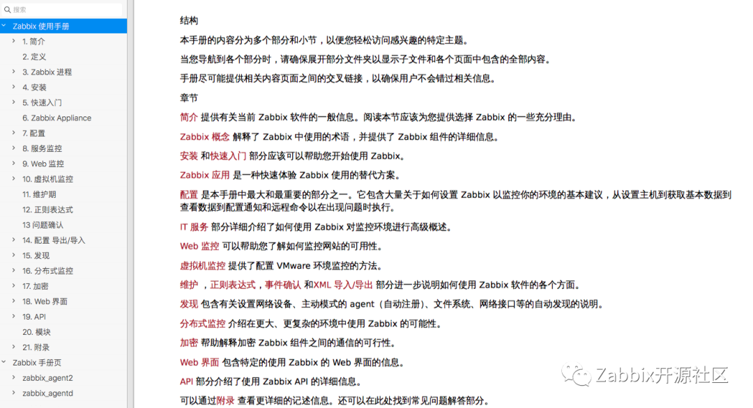 官方中文手册共1666页,分为21章,包含安装、快速入门、配置、发现、分布式监控、加密、API等多方面内容,是持续学习使用Zabbix的重要工具。这里有最详细、权威的使用向导。