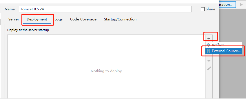 6、点击右边的 Deployment,然后按照下图依次点击,最后在弹框内找到上面打包好的 war 包文件: