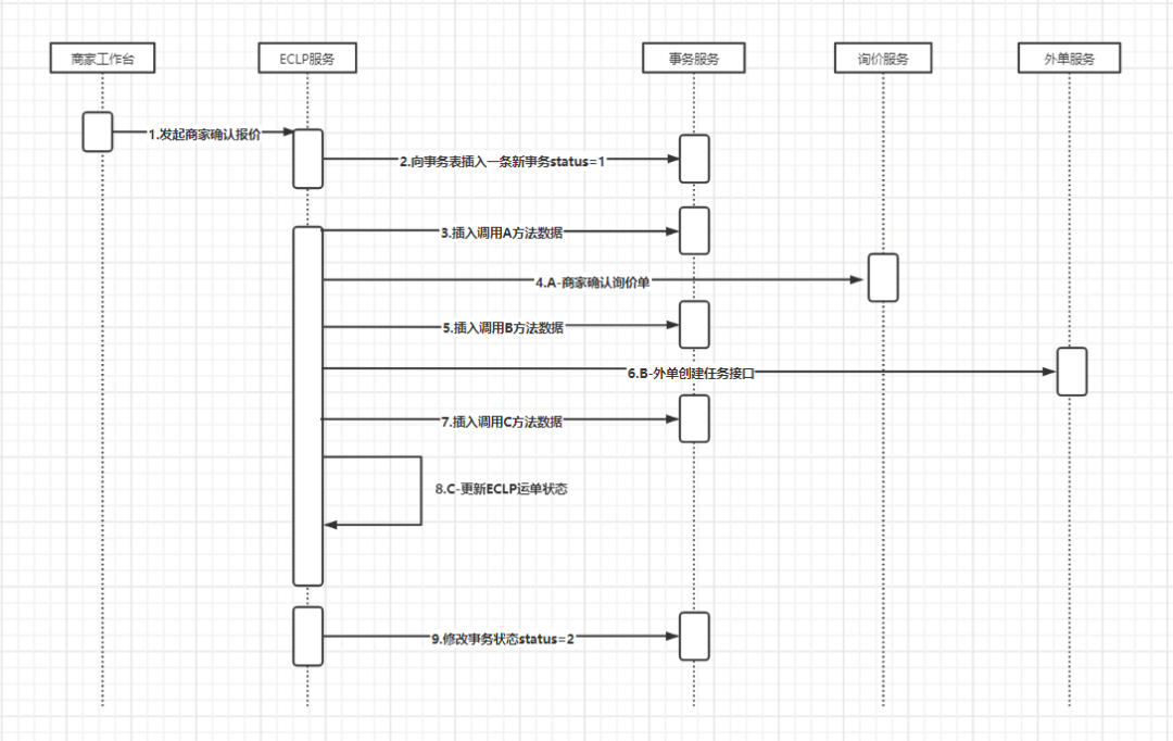 事务表:记录每次同步方法执行的状态,包括:1 - 进行中(同步方法执行开始)、2 - 已完成(同步方法执行成功)、3 - 失败(同步方法执行失败)、4 - 已回滚(回滚方法执行成功);方法调用表:记录一个完整的事务内所有方法的执行前入参、同步方法接口、回滚接口、回滚入参、方法执行顺序,如下图 3 描述:![]()