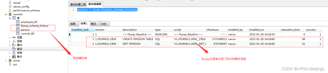 ##当flyway第一次运行时,会在我们对应的数据库中新建一个记录脚本运行情况的