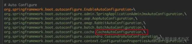 SpringBoot 自动化配置,体现在主配置类上复合注解 @SpringBootApplication 中的@EnableAutoConfiguration 上,该注解开启了 SpringBoot 的自动配置功能。该注解中的@Import(AutoConfigurationImportSelector.class) 通过加载 META-INF/spring.factotries 下配置一系列 *AutoConfiguration 配置类,根据现有条件推断,尽可能地为我们配置需要的 Bean。这些配置类负责各个功能的自动化配置,其中用于 SpringBoot Cache 的自动配置类是 CacheAutoConfiguration,接下来重点分析这个配置类就行了。