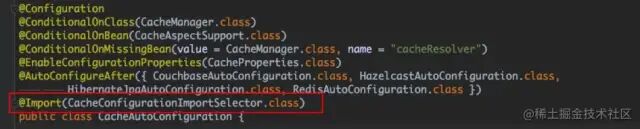 可以看到 CacheAutoConfiguration 上有许多注解,重点关注下@Import({CacheConfigurationImportSelector.class}),CacheConfigurationImportSelector 实现了 ImportSelector 接口,该接口用于动态选择想导入的配置类,这个 CacheConfigurationImportSelector 用来导入不同类型的 Cache 的自动配置类: