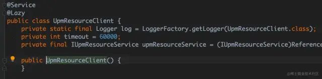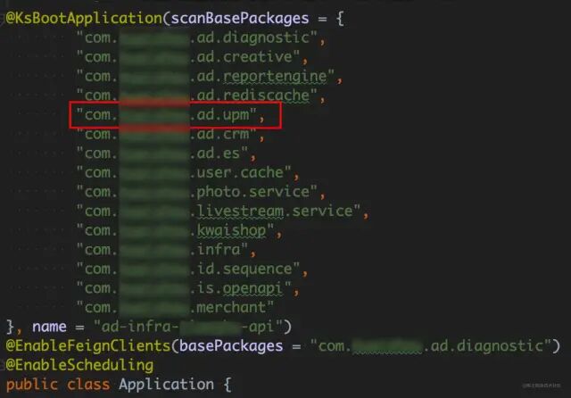 以 UPM 的依赖为例,之前的注入方式 是,项目依赖其 UpmResourceClient 对象,Pom 已经引用了其 Maven 坐标,并在主配置类上的 scanBasePackages 中添加了其服务路径:"com.xxx.ad.upm",通过扫描整个服务路径下的 class,找到 UpmResourceClient 并注入,因为该类注解了 @Service,因此会注入到服务的 Spring 上下文中,UpmResourceClient 源码片段及主配置类如下: