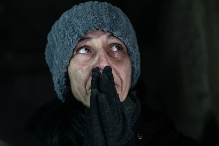 我在一条干道上,拍下第一组镜头,其中有俄罗斯士兵烧焦的遗体,他们躺在被毁坏的军用车辆和卡车旁边。一具遗体的下半身,从腰部以下都没有了。在布恰,士兵们警告我要紧跟一名指挥官,因为有地雷,甚至连遗体都可能是陷阱。我拍下了在一些平民庭院中发现的遗体。当时正在下雪,冷风彻骨,但一些平民侧身于所有被抛弃的俄罗斯军事装备中,战斗进行期间,他们一直在寻求地下庇护所。他们看起来既松了一口气,又饱受精神创伤。