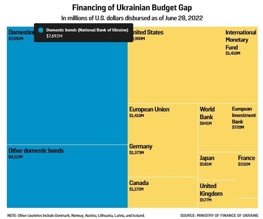 截至2022年6月28日支付的乌克兰预算缺口融资(单位:百万美元)。蓝色部分,自上而下:国内债券(乌克兰国家银行)、其他国内债券。黄色部分,自左至右、自上而下:美国、国际货币基金组织;欧盟、德国;世界银行、欧洲投资银行;日本、法国;加拿大;英国。