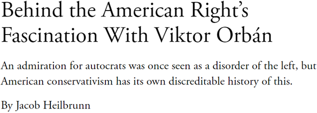 右翼对欧尔班的狂热在西方媒体上引发了某种表演性的困惑。《经济学人》的一个标题追问: “为什么美国右翼痴迷于欧尔班?”普林斯顿大学社会学教授金·舍贝利(Kim Lane Scheppele)在《国会山报》(The Hill )发表的一篇文章的标题是: “欧尔班让美国保守派眼花缭乱——他们从他身上看到了什么?”