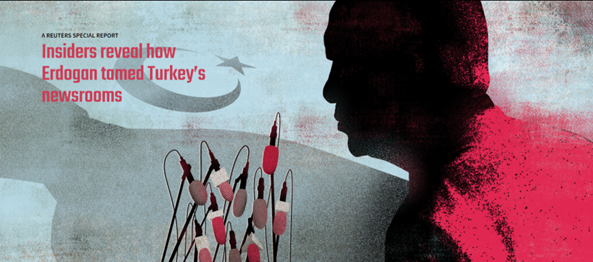这一插曲说明了,一度更能展示活跃思想交锋的土耳其主流媒体,是如何成为一个由政府批准的新闻标题、头版和电视辩论话题构成的严密指挥链的。通过对媒体消息人士、政府官员和监管机构的专访,我们勾勒出了一个与埃尔多安依自身意愿强加扭曲的其他前独立机构已不相上下的行业;他的批评者称,那些机构包括司法系统、军队、央行,以及教育系统中的很大一部分。接受路透社专访的人士表示,政府压力和媒体自我审查要为现况负责。